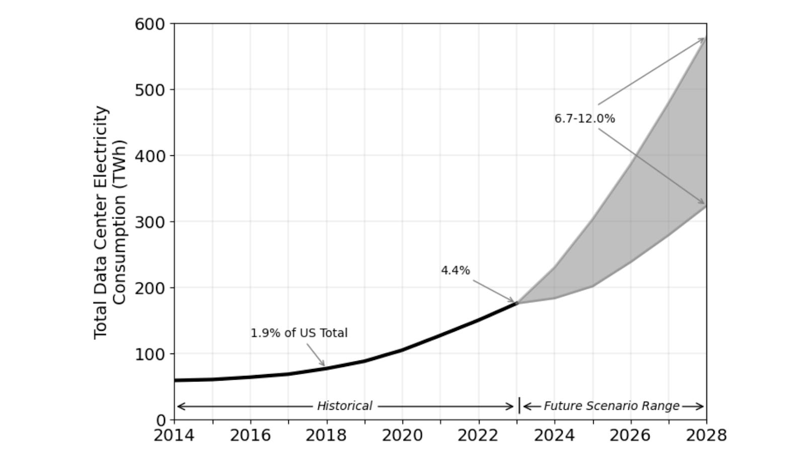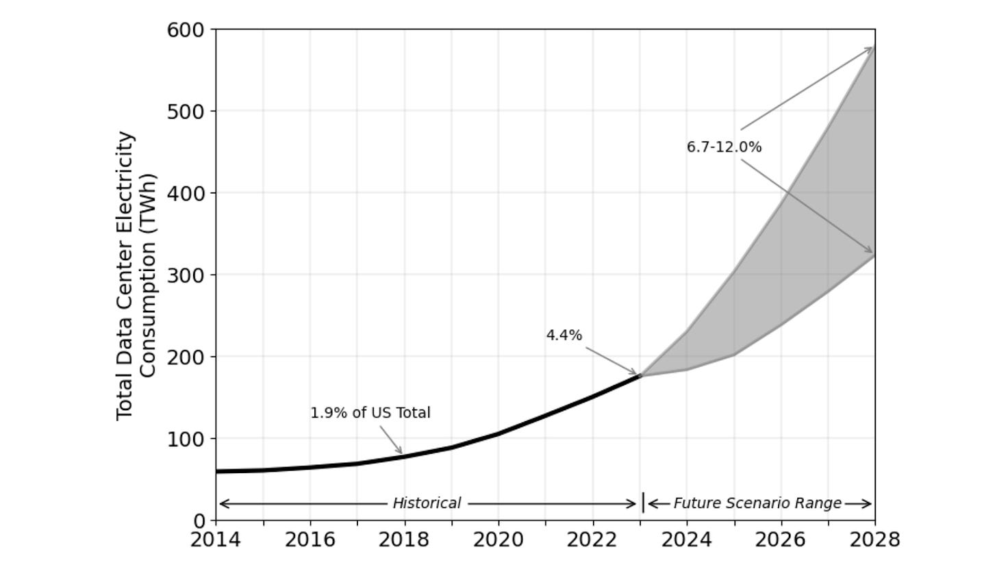 It’s difficult to precisely disentangle how much of the tech sector’s electricity is because of AI, since data centers handle many kinds of workloads. What is clear is that data center energy use is rising sharply, largely due to the AI boom. In 2024, US data centers consumed about 183 terawatt-hours (TWh) of electricity; over 4% of all US power use that year. To put that in perspective, that’s roughly as much electricity as the entire country of Pakistan uses in a year, and the trajectory is steeply upward. By 2030, US data centers’ power draw is projected to more than double to around 426 TWh, barring major efficiency breakthroughs. The Department of Energy anticipates data centers’ share of US electricity could reach 6.7 to 12% by 2028, up from about 4.4% in 2023.