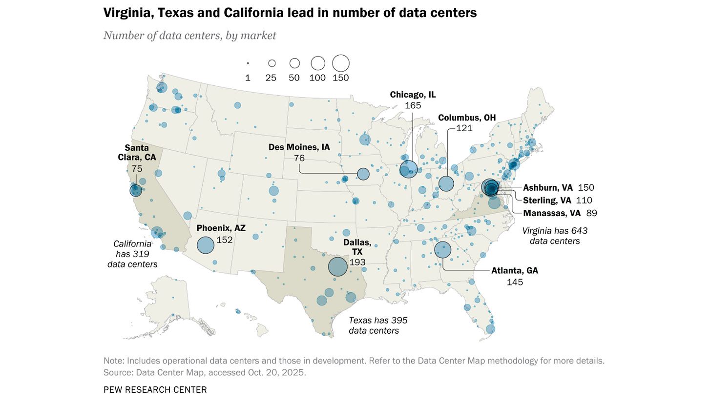 Electricity is only half of the story. AI also has a significant water footprint. Data centers withdraw water from local supplies (often municipal water or groundwater) to dissipate heat through evaporation. Let’s start with the big-picture numbers. In 2023, US data centers directly consumed an estimated 17 to 18 billion gallons of water for cooling. That sounds like a lot, and it is. It’s roughly equivalent to the annual water use of a US city of a few hundred thousand people. Even so, it represented only about 0.3% of the total US public water supply. In broad national terms, that’s a relatively modest share. For comparison, agriculture, power plants, and other industries account for far higher fractions of water withdrawals. However, those aggregate figures can be misleadingly small, because water use is highly local. Data centers tend to be built in clusters and often in places already prone to water stress. Recent reports show about two-thirds of US data center projects built since 2022 are in regions of high water stress (think of arid parts of the Southwest). In such areas, a single facility can indeed make a big difference.